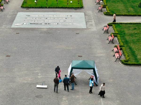 Сьогодні, 29-го квітня, в Ужгороді на площі Народній перед Закарпатською ОДА група людей почала встановлювати намети. Як повідомляють користувачі у мережі фейсбук, зокрема, навіс встановлює активіст Іван Данацко, який вже не вперше проводить різні акції перед адміністрацією.