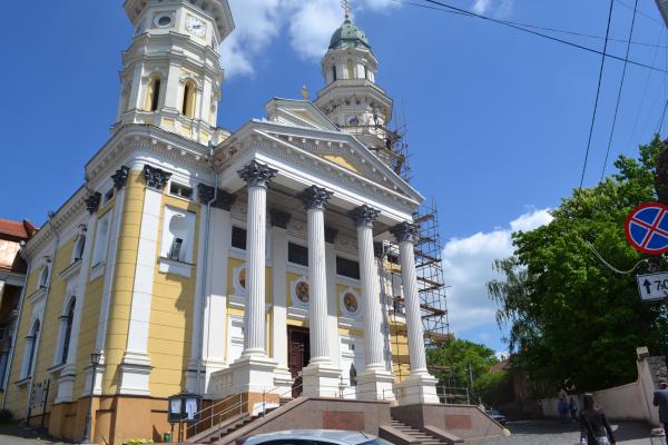 В Ужгороді продовжуються роботи з облаштування головного греко-католицького храму міста. Наразі частина Хрестовоздвиженського кафедрального собору обкладена риштованням. Нижню частину будівлі вже пофарбували, тепер фарбують одну з двох веж храму.