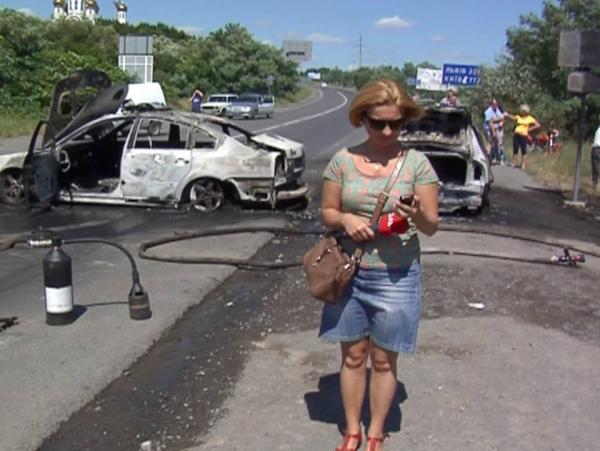 Журналістка ТСН Наталія Зотова оприлюднила фото, на якому зображені вщент згорілі автомобілі на трасі Київ-Чоп внаслідок розборок в Мукачеві.