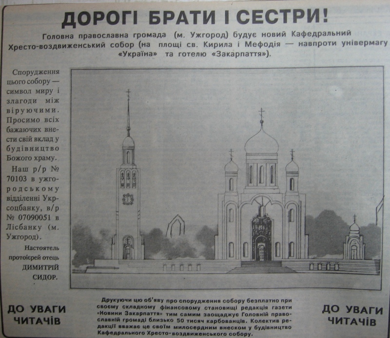 Газета “Новини Закарпаття” за 1992 рік зберегла цікавий спомин про те, як православна громада області збирала кошти на зведення в Ужгороді нового собору на площі Кирила і Мефодія. Як бачимо, за тодішнім проектом церковний комплекс виглядав трохи інакше: без надбудов з усіх боків та окремою дзвіницею-вежею. Не мало бути за першим проектом і паркану навколо собору. Архітектори передбачали, що це буде відкрита площа із зеленими насадженнями, посеред якої височітиме церковна споруда.
