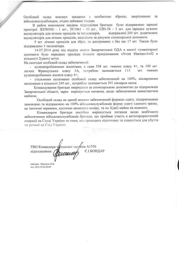 Натомість у відповіді повідомляється, що наразі на Ужгородській ділянці полігону проходить до підготовку особовий склад, який найближчим часом планують відправити у зону АТО. На кожного бійця відправлена заявка на ім'я Валерія Лунченка, з проханням надати допомогу у закупівлі необхідного майна.