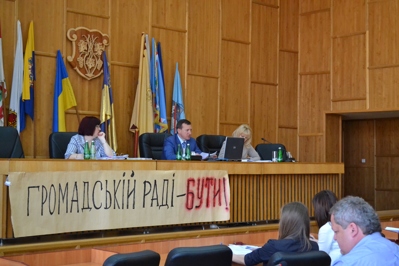 Відповідно більшість важливих і резонансних рішень, зокрема, проект регламенту міськради, перенеслися на сьогодні. Як і попереднього разу на початку сесії на президії вивісили плакати – тепер на банері йшлося про Громадську раду.