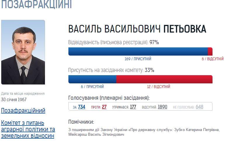 Василь Петьовка – відвідуваність (письмова реєстрація) – 97% (169 – присутній, 6 –відсутній), присутність на засіданнях комітету: 33% (6 – присутній, 12 –відсутній).