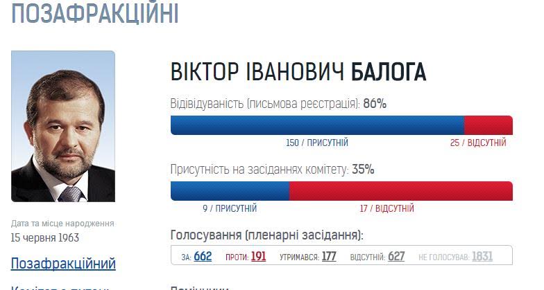 Віктор Балога – відвідуваність (письмова реєстрація) – 86% (150 – присутній, 25 – відсутній). Присутність на засіданнях комітету: 35% (9 – присутній, 17 – відсутній).
