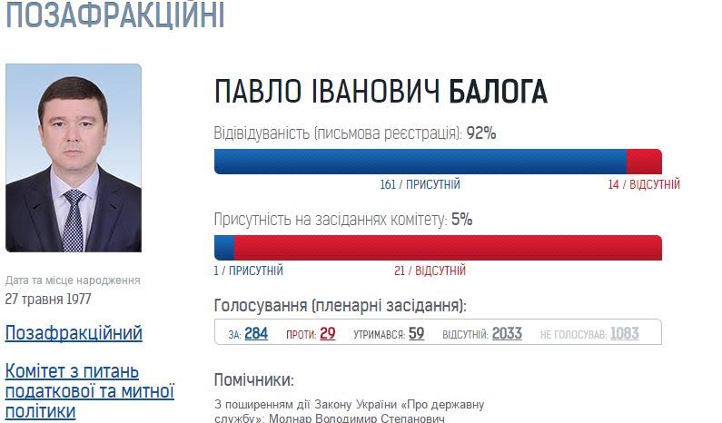 Павло Балога – Відвідуваність (письмова реєстрація): 92% (161 – присутній, 14 – відсутній). Присутність на засіданнях комітету: 5% (1 – присутній, 21 – відсутній).