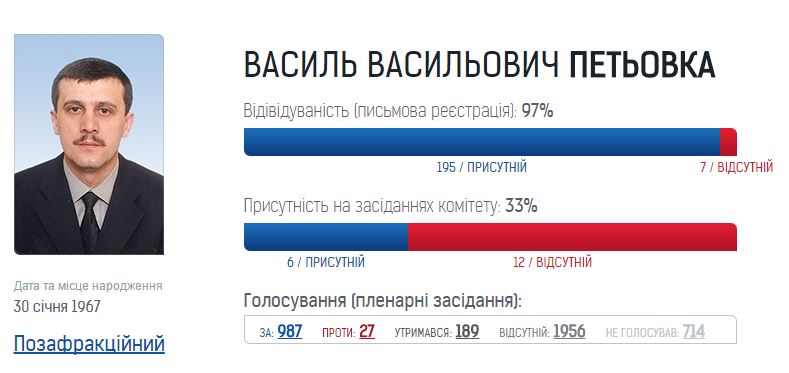 Василь Петьовка ("Воля Народу") – відвідуваність (письмова реєстрація) – 97% (195 – присутній, 7 – відсутній), присутність на засіданнях комітету: 33% (6 – присутній, 12 –відсутній).