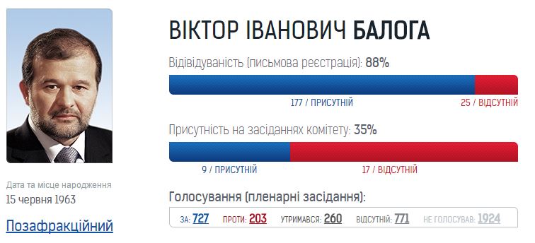 Віктор Балога (позафракційний) – відвідуваність (письмова реєстрація) – 88% (177 – присутній, 25 – відсутній). Присутність на засіданнях комітету: 35% (9 – присутній, 17 – відсутній).