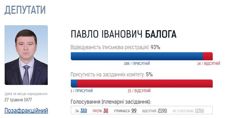 Павло Балога (позафракційний) – Відвідуваність (письмова реєстрація): 92% (161 – присутній, 14 – відсутній). Присутність на засіданнях комітету: 5% (1 – присутній, 21 – відсутній).