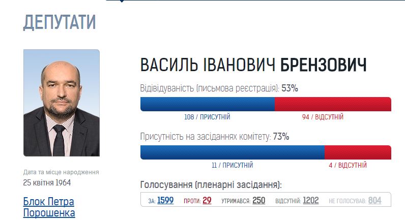 Василь Брензович (БПП) – відвідуваність (письмова реєстрація) всього – 53% (108 – присутній, 94 – відсутній), присутність на засіданнях комітету: 73% (11 – присутній, 4 –відсутній).