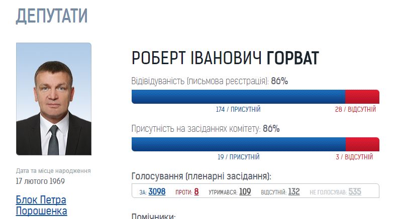 Депутат від БПП Роберт Горват – відвідуваність (письмова реєстрація) – 86% (174 – присутній, 28 – відсутній). Присутність на засіданнях комітету – 86% (19 – присутній, 3 –відсутній).