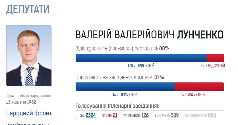 Нардеп Валерій Лунченко ("Народний Фронт") – відвідуваність (письмова реєстрація) – 88% (178 – присутній, 24 – відсутній). Присутність на засіданнях комітету: 67% (12 – присутній, 6 – відсутній).