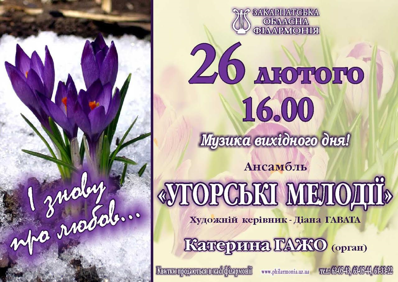 У рамках проекту “Музика вихідного дня” в обласній філармонії відбудеться концерт ансамблю “Угорські мелодії”. “Весна іде, красу несе, а в тій красі радіє все”, – так співається у відомій українській народній пісні. Справді, прихід весни особливо надихає на творчість, на романтичні почуття, мрії і сподівання. Тож і не дивно, що в один із останніх лютневих днів камерно-інструментальний ансамбль “Угорські мелодії” виступить із програмою “І знову про любов…” Народні пісні і танці, арії і дуети з відомих оперет, шедеври світової музичної класики якнайкраще відповідають тому весняному настрою, який вже давно відчувається у повітрі. Отже, 26 лютого у Закарпатській обласній філармонії для вас гратимуть і співатимуть Оніка Нодь (сопрано), Анжеліка Гербер (альт, цитра), Іштван Халус (тенор), Андрій Свид (тенор, контрабас), Євген Цанько (акордеон), Вільям Варга (кларнет) та ін. А додасть угорського колориту танцювальна пара у складі Андріани Торбич та Іштвана Кекерченя. Керівник колективу – лауреат міжнародних конкурсів Діана Гавата (віолончель). У програмі також візьме участь солістка Закарпатської обласної філармонії Катерина Гажо (орган). Концерт відбудеться у рамках проекту “Музика вихідного дня”. Початок концерту о 16.00.