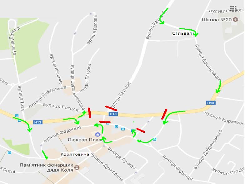 за перехрестям вул. Лучкая – пл. Корятовича (перед “Люксор-Плаза”);