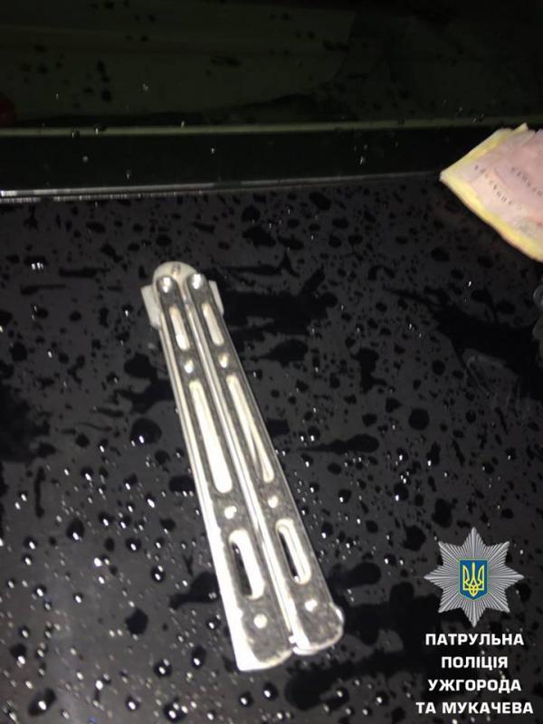 Інша подія трапилася на вулиці Ілони Зріні в Мукачеві, де, близько 1:00, патрульні побачили молодика, який, при вигляді полісменів, почав помітно нервувати. Згідно зі статтею 34 ЗУ “Про Національну поліцію” патрульні провели поверхневу перевірку й виявили згорток із порошкоподібною речовиною білого кольору, схожою на наркотичну – вагою біля 0,05 грамів. Також у чоловіка знайшли предмет схожий на ніж, довжиною біля 10 сантиметрів.