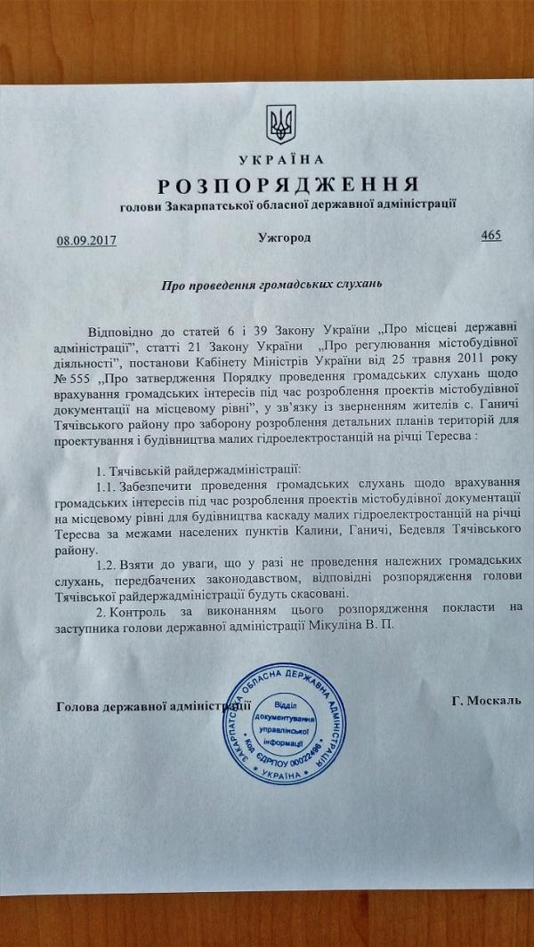 Як сказано в документі, у разі не проведення належних громадських слухань, передбачених законодавством, відповідні розпорядження голови Тячівської РДА про розроблення детального плану території для будівництва малих гідроелектростанцій за межами населених пунктів Тячівського району будуть скасовані. Таким чином у резонансному питанні про будівництво каскаду міні-ГЕС на р. Тересва буде покладено крапку.