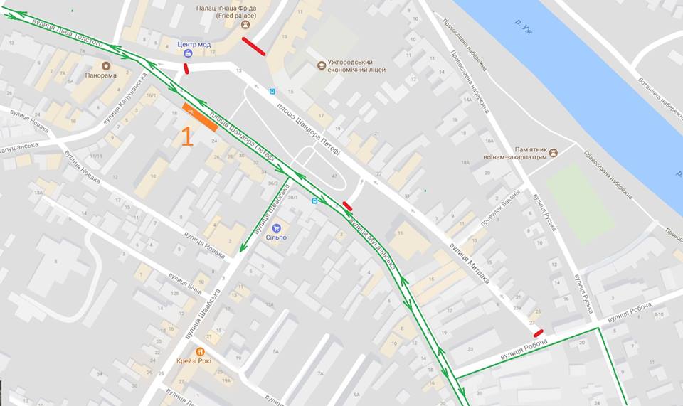Нагадаємо, автомобільний рух на площі Петефі перекриють від вул. Митрака до вул. Л. Толстого), в організації проїзду площею будуть наступні зміни: