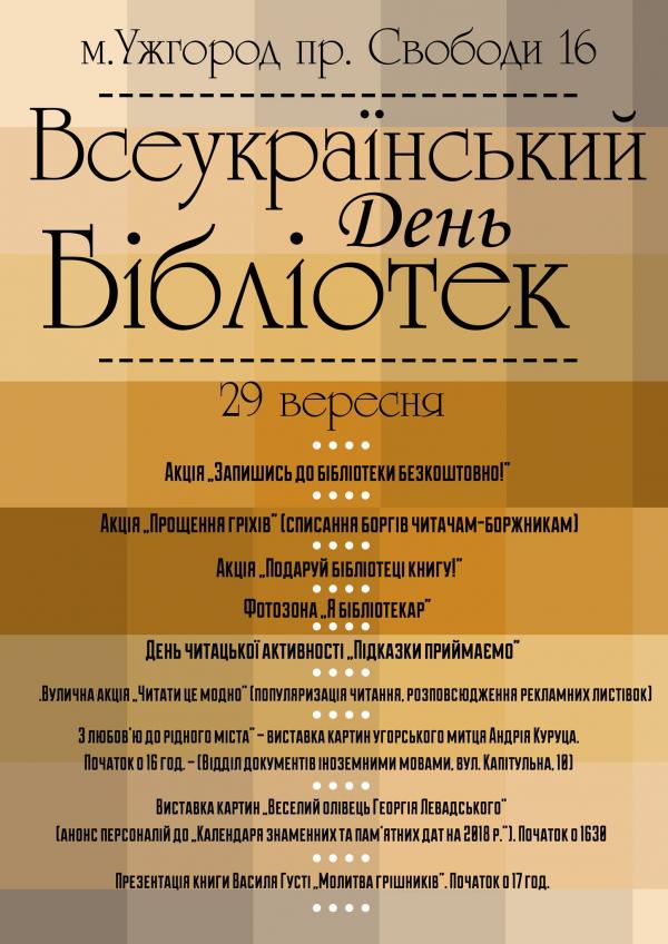 29 вересня, у переддень Всеукраїнського дня бібліотек, Закарпатська обласна універсальна наукова бібліотека ім. Ф.Потушняка підготувала низку цікавих заходів для своїх користувачів, серед яких: