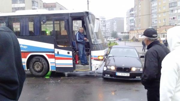 Очевидно, водій автобуса, на швидкості не зумів зупинитися вчасно і протаранив BMW, який повертав з проспекту Лесі Українки на вул. Дзвонарську.