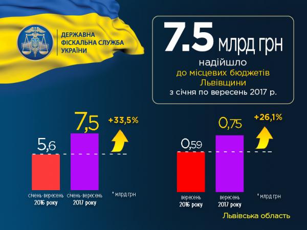 Платники податків Львівщини за дев'ять 2017 року забезпечили надходження податкових платежів до місцевих бюджетів на суму 7 459,1 млн. грн., що на 338,2 млн. грн. або на 4,7% більше показника бюджетного розпису, затвердженого місцевими радами.
