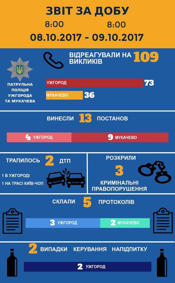 Патрульна поліція Ужгорода та Мукачева інформує про події минулої доби: два ДТП, по одному на трасі Київ-Чоп та в обласному центрі. Затримано двох пияків за кермом. Вдалося розкрити аж три злочини тощо.  Деталі в інфографіці: