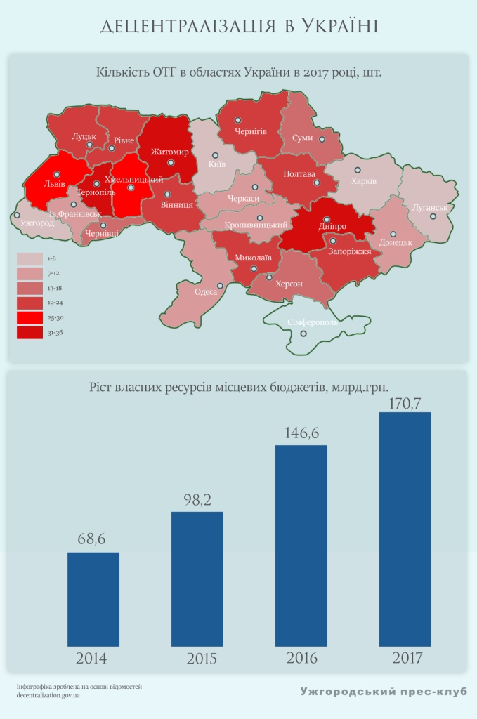 Наразі в Україні – п'ять ключових областей, де справа добре зрушила з місця: у Житомирській, Хмельницькій, Дніпропетровській, Тернопільській та Львівській  областях – найбільше створених та уже діючих територіальних громад – 50% усіх ОТГ в Україні. Однак, є такі, що добряче відстають. Наприклад, Закарпатська область, Івано-Франківська, Харківська, Київська (до 6 ОТГ у кожній).