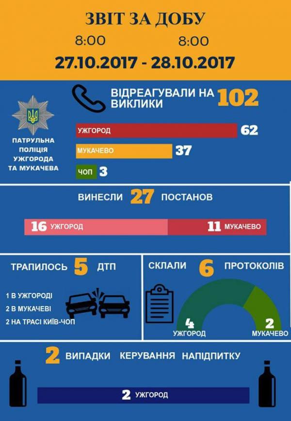 Як повідомляє Патрульна поліція Ужгорода та Мукачева, протягом доби з 8.00 п'ятниці до 8.00 суботи поліцейські відреагували на 102 виклики, більшість з яких – 62 – традиційно були з обласного центру. За цей час трапилися 5 ДТП: одна – в Ужгороді, дві – в Мукачеві, та ще дві – на трасі “Київ-Чоп”. За порушення патрульні винесли 27 постанов, також двох водіїв запідозрили у кермуванні напідпитку.
