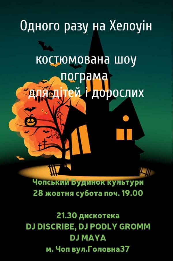 Сьогодні у Чопі відбудеться велике святкування Хелловіну. У міському Будинку культури проведуть тематичний вечір для дітей та дорослих “Одного разу на Хелловін”. Захід розпочнеться о 19.00, після нього ж молодь запрошують продовжити вечірку дискотекою. Організатори просять не лише прийти у костюмах, а і взяти з собою солодощі.