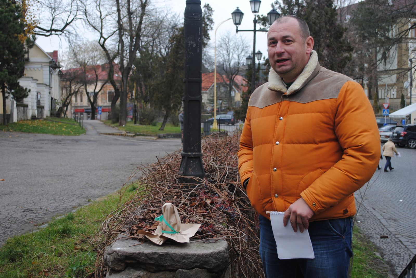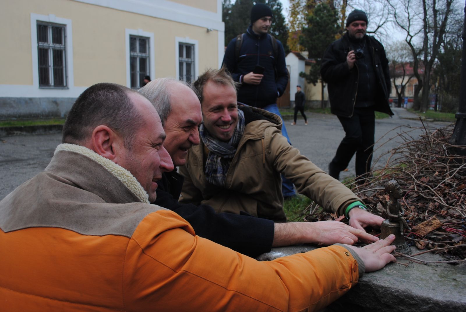Цього разу у бронзі відлили першого губернатора Закарпаття Григорія Жатковича, який сидить на дзвонику. Відкривали скульптурку автор Михайло Колодко разом з одним із перших губернаторів Закарпаття після проголошення Незалежності України Сергієм Івановичем Устичем.