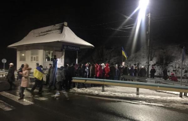 Люди ходять по пішохідному переході в межах посту “Нижні Ворота”. Учасники протесту блокують виключно вантажний транспорт, але пропускають легковий та мікроавтобуси.