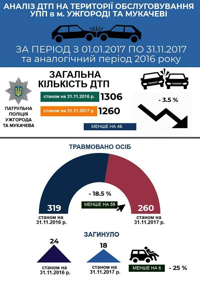 Патрульна поліція Ужгород та Мукачева проаналізувала стан та кількість цьогорічних автопригод на території обслуговування УПП. Автоаварій та травмованих значно поменшало. деталі в інфографіці: