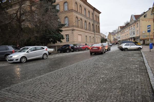 Із бруківки, яка дещо відрізняється кольором, виклали смуги дорожньої розмітки та смуги між місцями для паркування. Червоною бруківкою оформили пішохідний перехід.
