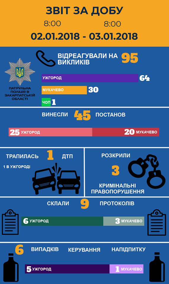 Патрульна поліція Закарпатської області інформує про події минулої доби. Трапилася одна ДТП в обласному центрі. “Попалися” аж 6 п'яних водіїв, з яких 5 – ужгородці. Вдалося розкрити 3 кримінальні правопорушення. Загалом, патрульні відреагували на 95 викликів. Деталі в інфографіці: