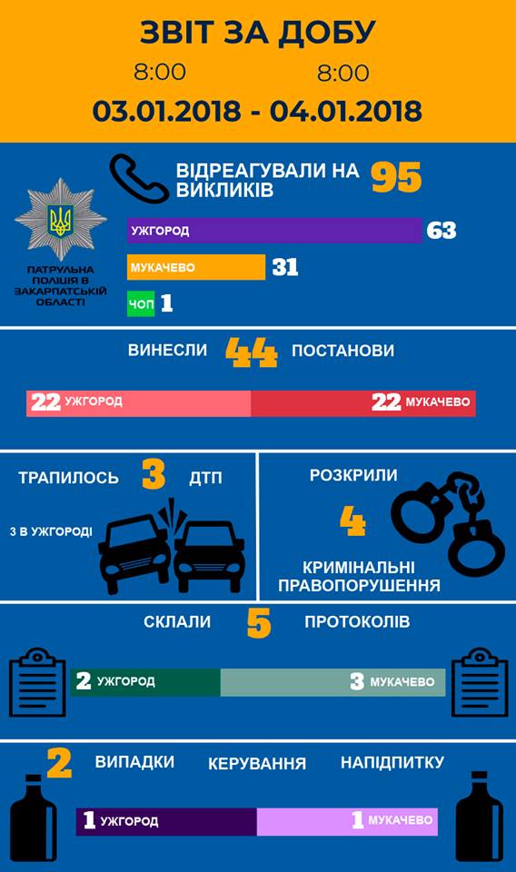 Патрульна поліція Закарпатської області інформує про події минулої доби: трапилося три автоаварії в Ужгороді. Затримано 2 нетверезих водіїв, по одному в Ужгороді та Мукачеві. Розкрито 4 кримінальних правопорушення. Загалом патрульних краяни викликали 95 разів, найбільше – 63 разів – в обласному центрі. Деталі в інфографіці: