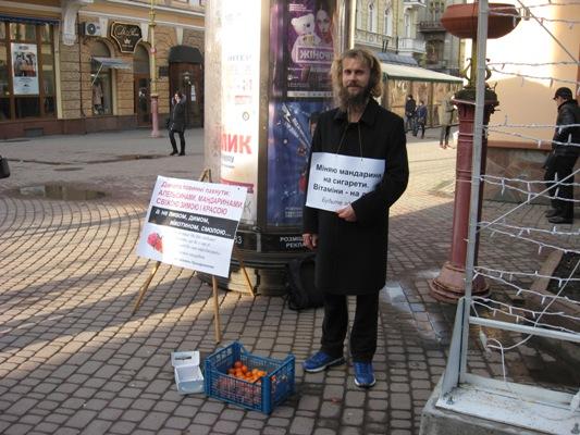 Ініціатор акції житель Івано-Франківська Андрій каже, що це вже не перша його така акція. Минулого разу він пропонував дівчатам поміняти сигарети на яблука. На грудях Андрія висить інший плакат з написом “Міняю мандарини на сигарети, вітаміни на дим. Будьте здорові!”