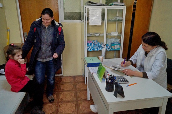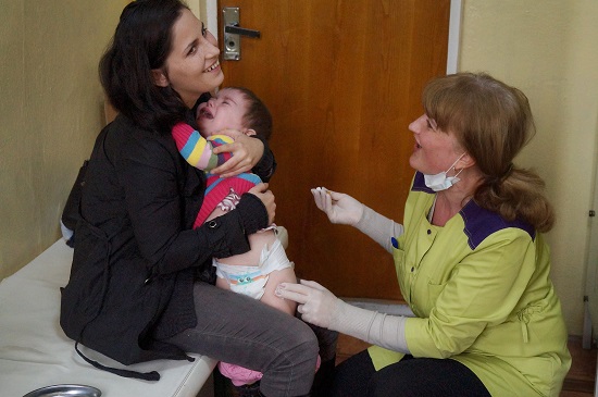 Малеча міста отримує щеплення від корі в поліклініці, кабінет №32.