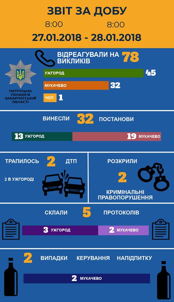 Патрульна поліція Закарпатської області інформує про події вчорашньої доби: 78 викликів, з них по Ужгороду – більше половини. Винесено 32 постанови, складено 5 протоколів.