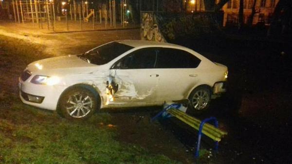 За дві години цей же автомобіль скоїв ДТП на вул. Винниченка. Патрульним водій розповів, що не впорався з кермуванням і врізався у припаркований автомобіль та злетів з дороги. В результаті автомобіль опинився біля скейт-майданчика у сквері. Машина понищила дерева, газони і розтрощила лавочку.