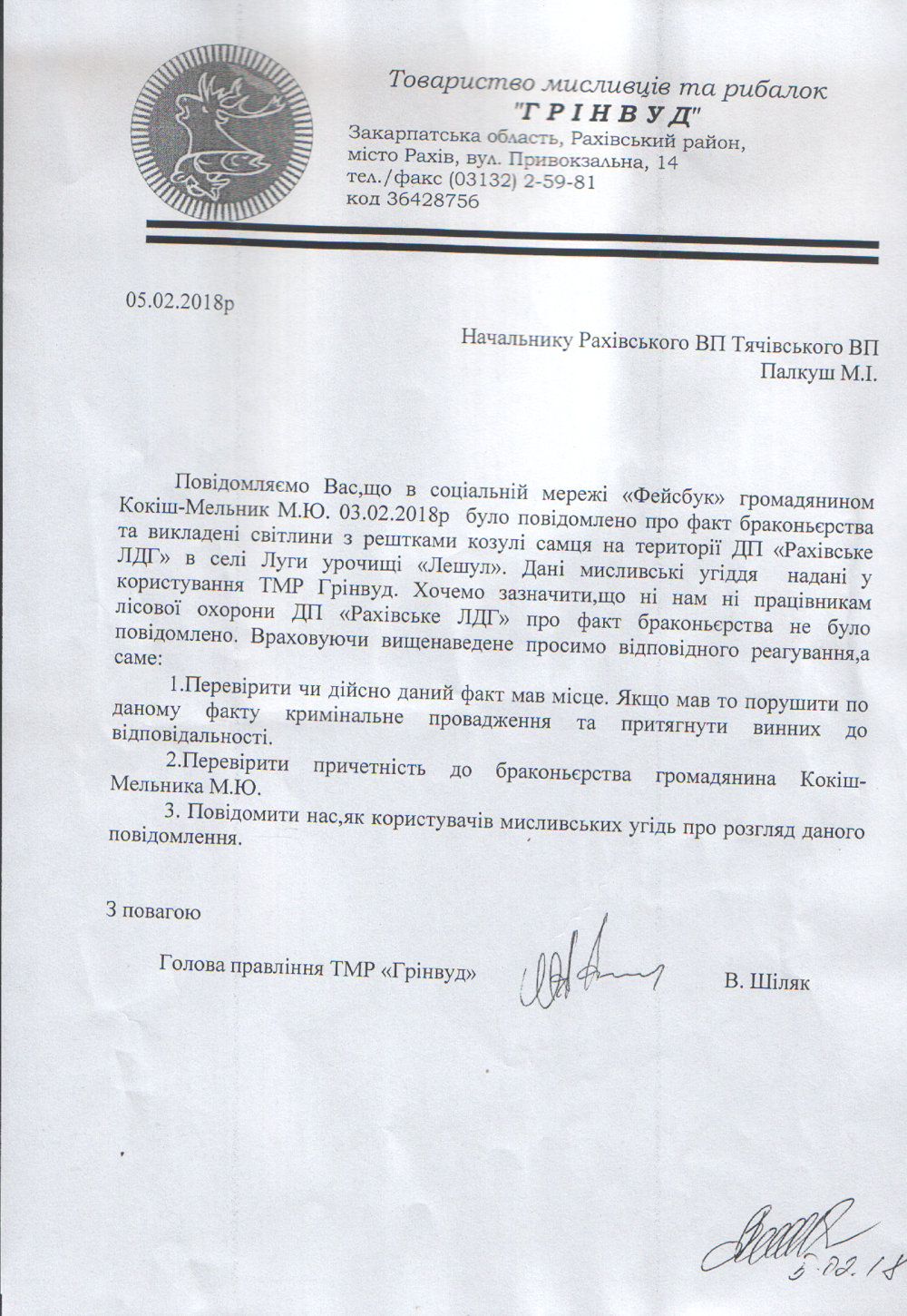 У свою чергу голова правління ТМР “Грінвуд” Василь Шіляк звернувся до правоохоронних органів для розслідування вищезазначеного факту та перевірити, яким саме чином і звідки у громадянина Миколи Кокіш-Мельника з'явилися фотосвітлини трупа дикої тварини у громадянина Кокіш-Мельника.