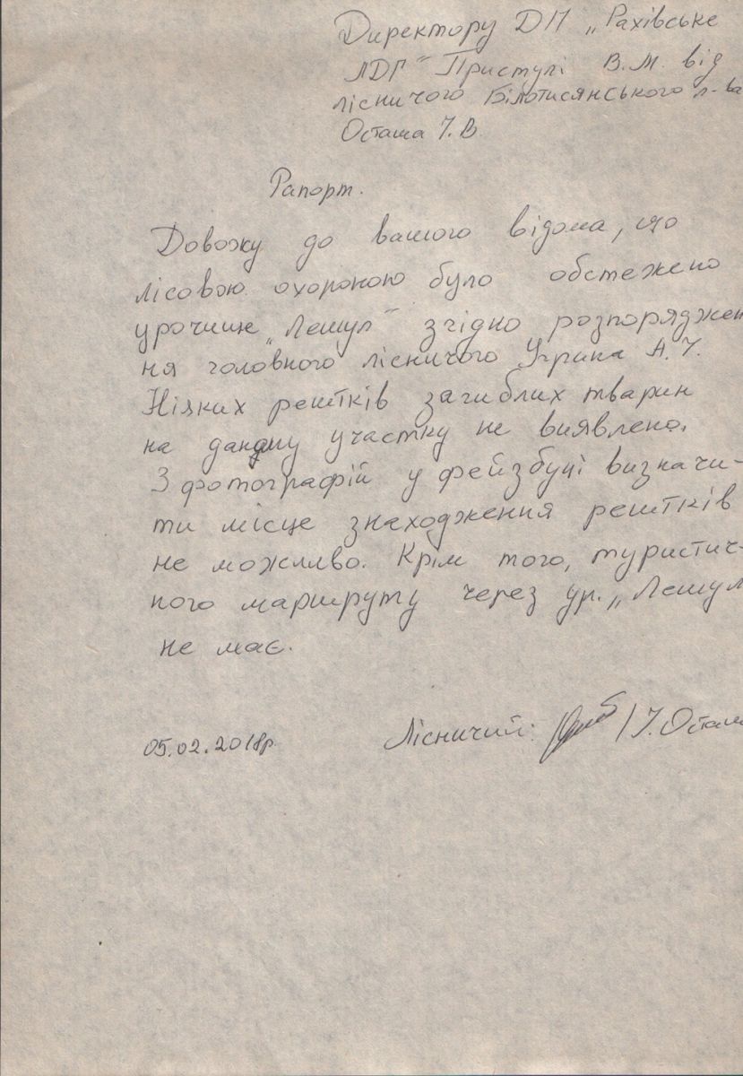 Після оприлюднення фото, на території мисливських угідь у селі Луги урочища “Лєшул” працівниками державної лісової охорони Білотисянського та Говердянського лісництв було обстежено територію мисливські угіддя та перевірено правдивість інформації на предмет залишків дикої тварини.