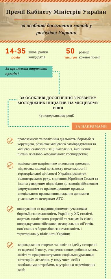 До 1 березня можна подавати пропозиції щодо кандидатів на присудження Премії Кабінету Міністрів України за особливі досягнення молоді у розбудові України.