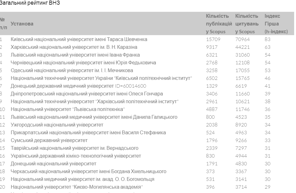 У рейтинговій таблиці вищі навчальні заклади України ранжовані за індексом Гірша —показником, що базується на кількості наукових публікацій і кількості їх цитувань.