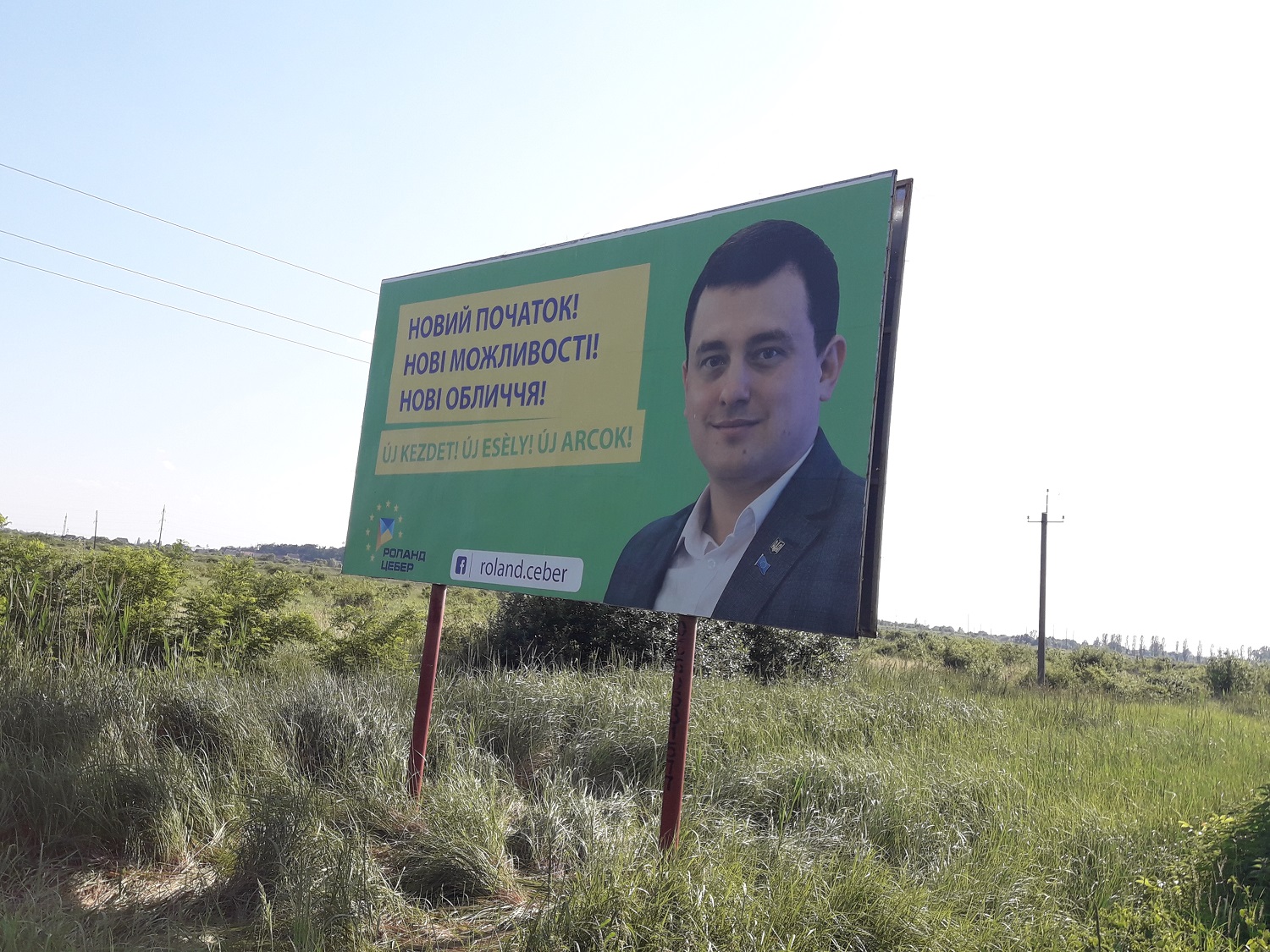 У місті Берегові з початку літа почали з’являтися плакати із фотографією депутата Ужгородської районної ради від БПП “Солідарність” Роланда Цебера. Білборд виготовлений у зелено-жовтих тонах із написом “Новий початок! Нові можливості! Нові обличчя!”. Також на плакаті напис продубльований угорською мовою.