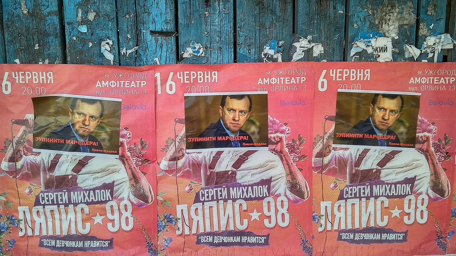 Крім цього, в Ужгороді на дошках оголошень та на деяких парканах можна побачити листівки, які містять ознаки чорного піару на адресу міського голови Ужгорода – Богдана Андріїва. Останній, як відомо, увійшов до списку партії “Опозиційний Блок”. На листівці зображене фото міського голови Ужгорода та напис “Зупинити мародера”. У правому нижньому куті листівки є підпис – Павло Федака. На листівках немає вихідних даних – інформації про замовника, тираж, установу, що здійснила друк тощо.