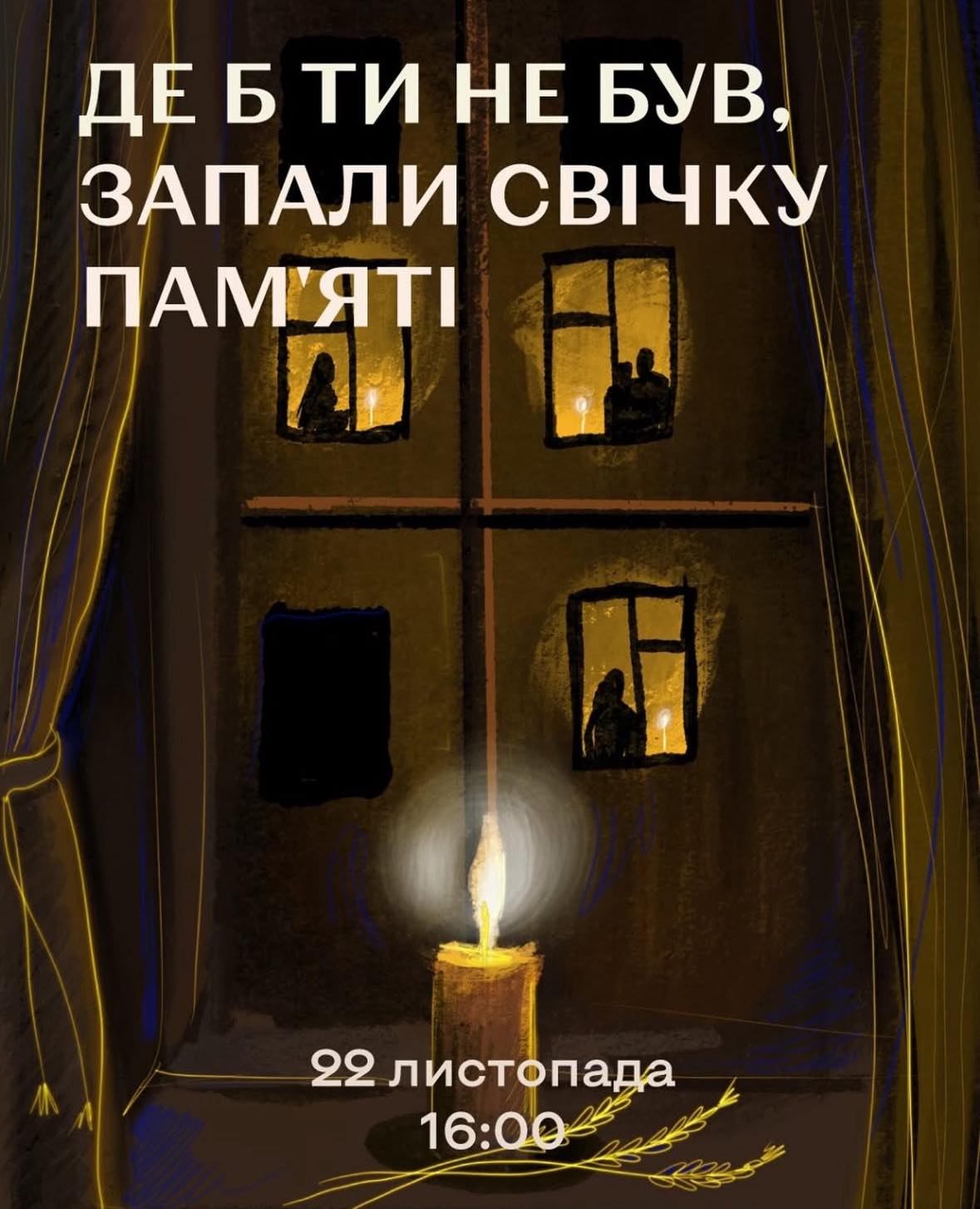 Закликаємо усіх згадати в Загальнонаціональній хвилині мовчання сьогодні о 16.00 про мільйони людських життів, які Україна втратила через штучні голодомори. Сьогодні всі ми, хто б де не був, маємо об’єднатися у хвилині мовчання, зупинитися і віддати шану закатованим голодом. І незалежно від місця знаходження запалити Свічку пам’яті у вікні. «Де б ти не був, запали Свічку пам’яті», – гасло сьогоднішнього дня.