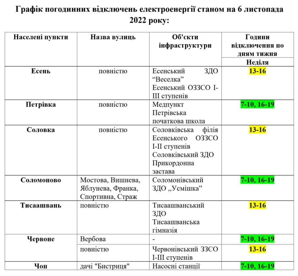 На сайті ПрАТ «Закарпаттяобленерго» оприлюднено графіки погодинних відключень електроенергії станом на 6 листопада 2022 року: