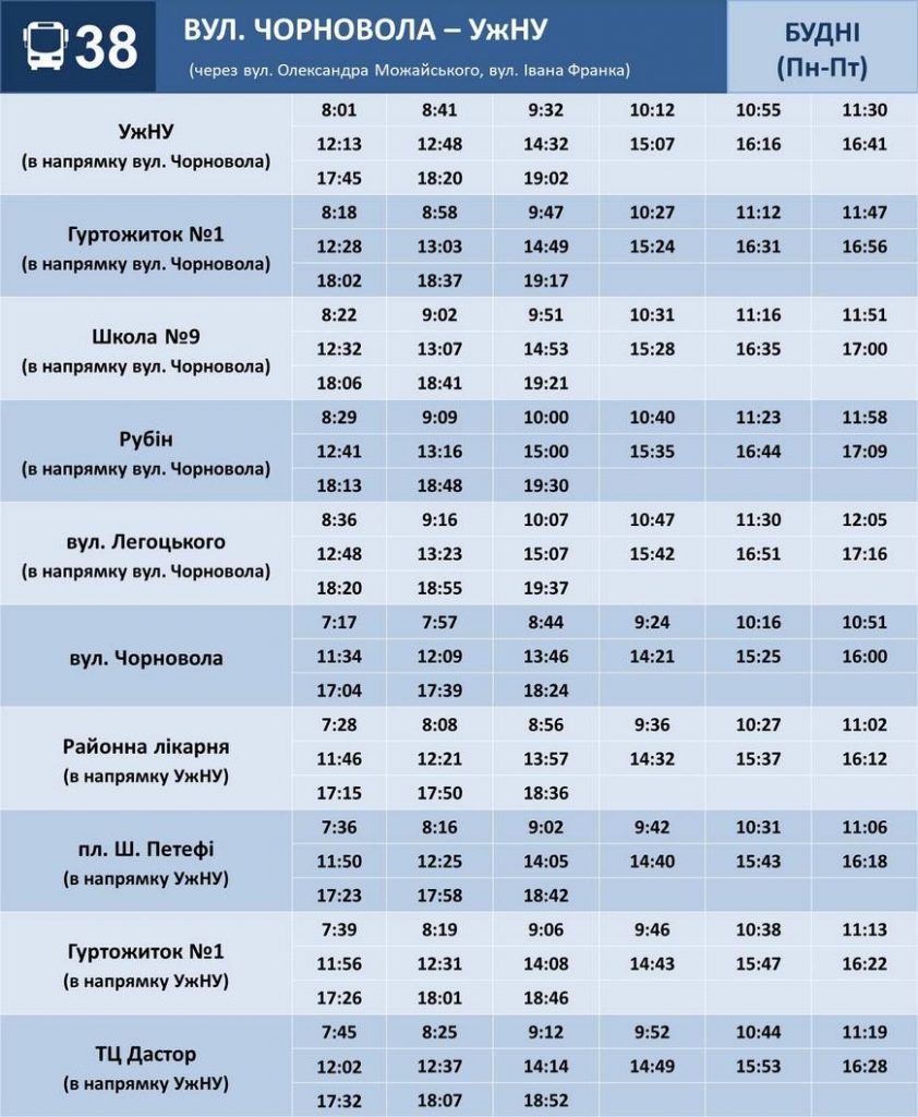 Головна » Соціум Графік руху у будні автобуса №38 в Ужгороді Опубліковано: 10:45, 15.08.2022 Закарпатські новини КП “Ужгородський муніципальний транспорт” надає актуальний – відсьогодні, 15 серпня – графік руху у будні автобуса №38. Ужгородська міська рада