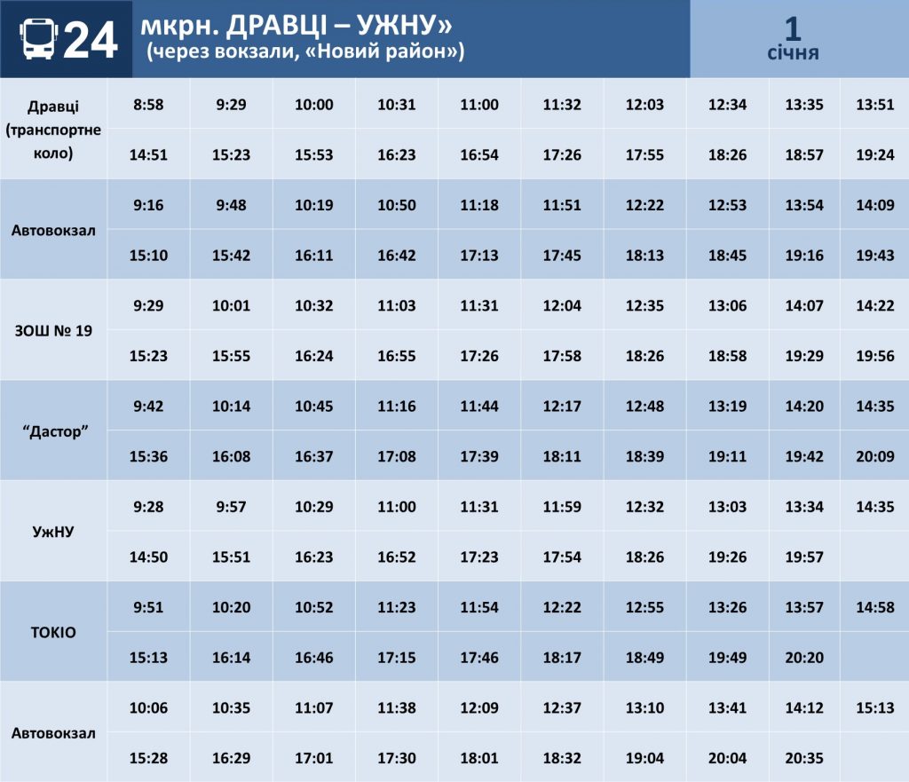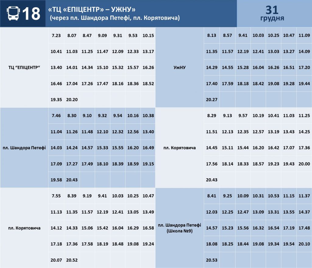 КП «Ужгородський муніципальний транспорт надає інформацію про графіки руху автобусів на міських маршрутах №№18, 20 та 24 на 31 грудня та 1 січня.