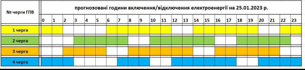 Головна » Соціум Графіки відключення електроенергії на Закарпатті Опубліковано: 11:21, 25.01.2023 Закарпатські новини ПрАТ «Закарпаттяобленерго» повідомляє прогнозовані години включення/відключення електроенергії на 25 січня. Перевірити свою чергу можна в чат-ботах:TelegramViber