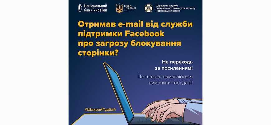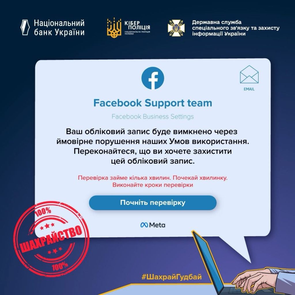 Шахраї надсилають листи на адреси електронної пошти від імені служби підтримки Facebook. У таких листах повідомляють про можливе порушення умов використання та загрозу блокування акаунту. Щоб нібито уникнути блокування, користувачеві пропонують перейти за посиланням та пройти перевірку. Посилання спрямовує на шахрайський сайт, який виглядає як офіційний сайт Facebook.