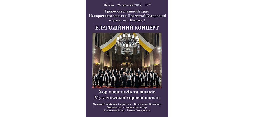 У неділю, 26 жовтня, у греко-католицькому храмі Непорочного зачаття Пресвятої Богородиці в Іршаві відбудеться благодійний концерт хору хлопчиків та юнаків Мукачівської хорової школи.